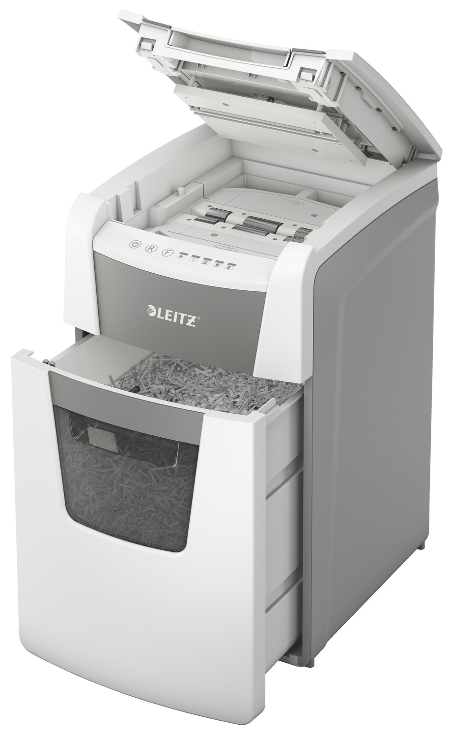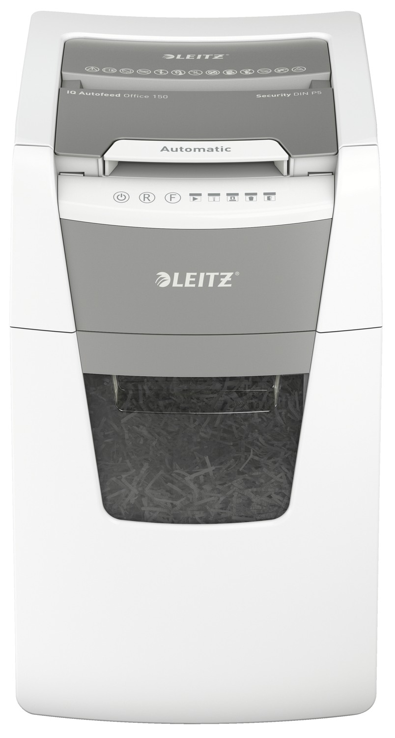 Distrugator automat documente Leitz IQ Office , 150 coli , P5 , micro-cut (tip particule) , cos 44 litri , alb-gri , Leitz Cod Produs: 80140000