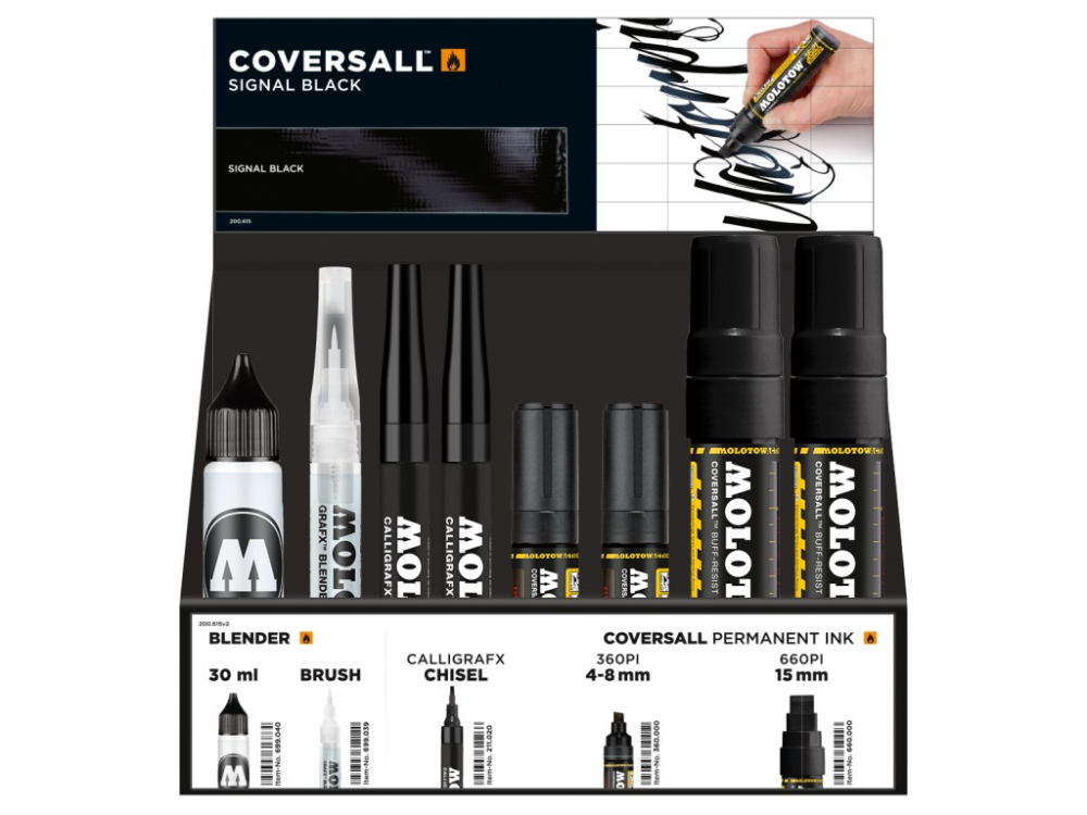 Display-ul preferat al oricarui designer contine 6 markere Blender cu pompita ce permit iluminarea culorilor, 3 rezerve de 30 de ml pentru acestea, 12 softlinere cu pompita Caligrafx 2 mm si 12 markere Coversall™ cu varfuri de 4-8 sau 15 mm. Atat softlinerul Caligrafx, cat si markerele Coversall™ contin cerneala pe baza de alcool cu bitum sintetic; sunt lucioase, opace, permanente, se usuca rapid, sunt aplicabile pe aproape toate suprafetele de interior sau exterior, reincarcabile si prevazute cu varfuri schimbabile. in plus, markerele Coversall™ sunt echipate cu sistem capilar patentat si flux consistent de vopsea datorat supapei FLOWMASTER™. Perfecte pentru caligrafie si suprafete mari.